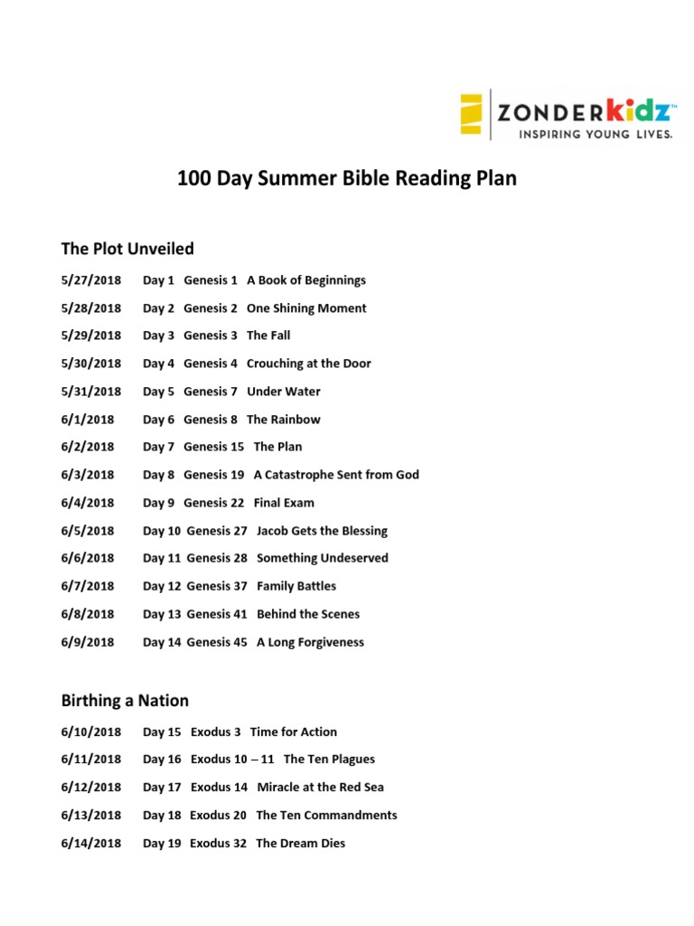 Alternatively the following Bible reading plans are available as PDF downloads for easy printing. Download Printable Bible in a Year Reading Plan. JAN 1 Genesis 1-2 Matthew 1 JAN 2 Genesis 3-5 Matthew 2 JAN 3 Genesis 6-8 Matthew 3 JAN 4 Genesis 9-11 Matthew 4 JAN 5 Genesis 12-14 Matthew 51-26 JAN 6 Genesis 15-17 Matthew.